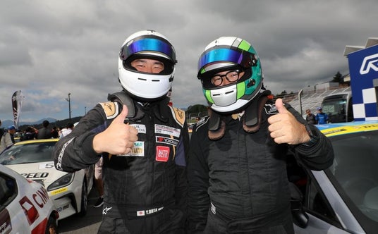 頂上決戦2025のSundayRace優勝者マイケル田中選手(右)アマチュア箱物最高峰のレースの一つであるGR86/BRZCup。67名の参戦者があった富士スピードウェイラウンドで、初参戦20位という快挙を成し遂げた。