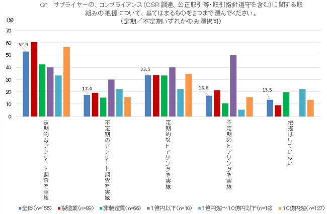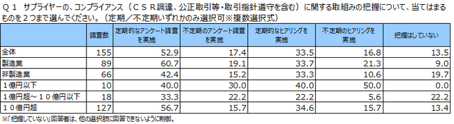 全体では、86.5%(134社/155社)がアンケートあるいはヒアリングの手法を用いて、取引先(サプライヤー)へコンプライアンス、CSR調達に関する取り組みの把握を行っている。また、製造業が非製造業よりも実施割合が高い傾向にある。