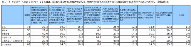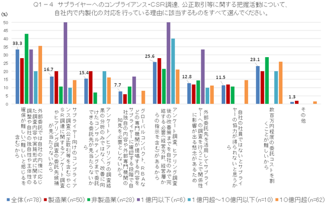 取引先(サプライヤー)へのコンプライアンス・CSR調達に関する把握活動について、自社内で内製化の対応を行っている理由は、「外部委託では自社の内情に応じた調査内容や実施形式に関する調整や自社の独自性や主体性の確保が難しい」が33.3%と最も高く、次いで、「アンケート調査、ヒアリング調査後の改善策までを自社のみで完結する必要(経営方針、経営層からの指示含む)があるから」が25.6%である。また、「数百万円の委託コストを割くことが難しいから」は23.1%と全体の1/4程度にとどまる。
