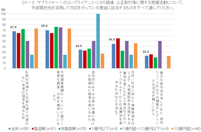 取引先(サプライヤー)へのコンプライアンス・CSR調達に関する把握活動について、外部委託先を活用している理由は、「外部調査機関のノウハウに基づく高度な調査・分析を期待しているから」が69.6%と最も高く、次いで、「お取引先様から可能な限り、忖度のない本音の回答を得るため」が67.9%となっている。また、「社内/社外に向けて情報発信を行う上で、外部委託先を活用する必要性を感じたから(株主などのステークホルダーからの信頼性を高めるためなどを含む)」は、44.6%である。