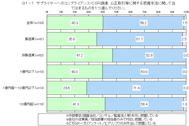 取引先(サプライヤー)へのコンプライアンス・CSR調達に関する取り組みの把握手法(外部委託を行っているか自社内で内製化しているか)は、全体の40.3%が「外部委託を行い把握している」と回答し、「どちらか一方のみ外注して把握している」の1.5%とあわせて、41.8%(56社/134社)が外部の調査会社などの独立した第三者の専門機関を活用し、取引先管理(外部委託先管理)の取り組み実態を把握している。
