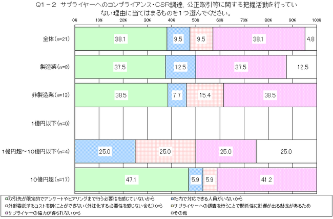 6.「把握していない」企業の理由(21社)としては、「取引先が限定的でアンケートやヒアリングまで行う必要性を感じないから」と「サプライヤーの協力が得られないから」が各38.1%であり、次いで、「社内で対応できる人員がいないから」「外部委託するコストを割くことができない(外注化する必要性を感じない含む)から」が各9.5%である。また、「その他」は4.8%となっている。