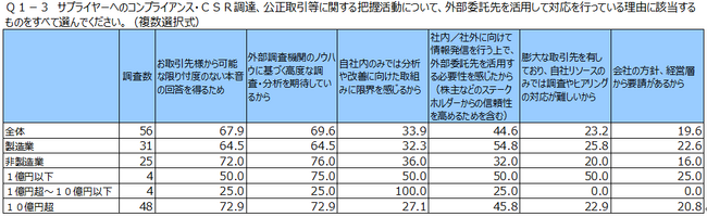 製造業と非製造業との比較では、「外部委託では自社の内情に応じた調査内容や実施形式に関する調整や自社の独自性や主体性の確保が難しいから」と「数百万円程度の委託コストを割くことが難しいから」は、製造業よりも非製造業が高い選択割合となっている。一方で、「アンケート調査、ヒアリング調査後の改善策までを自社のみで完結する必要があるから」は、製造業の方が非製造業よりも選択割合が高い。