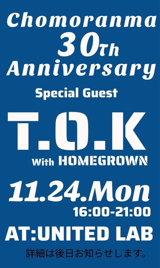 CHOMORANMA 30th Anniv.さらに、福岡を拠点とし今年活動30周年のレゲェクルー「CHOMORANMA SOUND」その特別なアニバーサリーイベントに本場ジャマイカから「T.O.K」が来日!バックバンドに日本が誇るレゲェバンド「HOMEGROWN」を携え、スペシャルな公演が「UNITEDLAB」で開催されることが決定!地元の主催者やクリエイターからの信頼と支持を集めている。