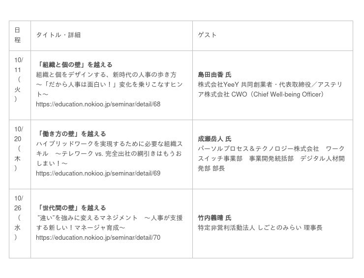 この3つの壁がなぜ問題なのか?どこに課題があるのか?そして、壁を乗り越えるために、人事はどう現場を支援するのか?組織開発のプロフェッショナルである沢渡あまね氏と、企業の組織開発・人材育成を多数支援するNOKIOOの小田木朝子氏の2名がゲストと共に、スピーカーと対話しながら進めるライブ型セミナーで、参加者の悩みや課題にお応えします。