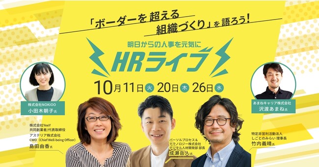 登壇者に、株式会社YeeY/島田由香 氏、パーソルプロセス&テクノロジー株式会社/成瀬岳人 氏、特定非営利活動法人しごとのみらい/竹内義晴 氏、作家・ワークスタイル&組織開発専門家/沢渡あまね氏をお招きし、今、人事に求められる組織づくりへの戦略的な関わり方について参加者とインタラクティブに深めるライブ感200%のセミナーをお届けします。