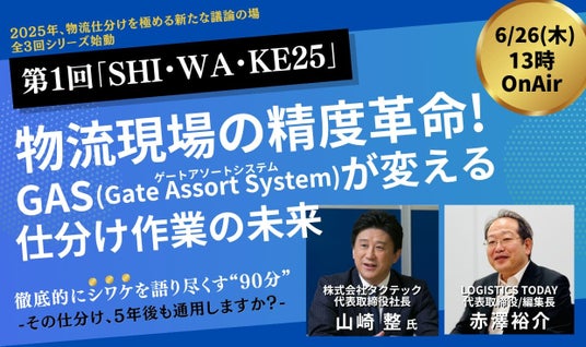 この度、物流の現場における最重要課題のひとつ「仕分け」に、創業当初から一貫して取り組んできた株式会社タクテック(東京都文京区、代表取締役社長:山崎整、以下タクテック)と国内最大の物流ニュースサイト「LOGISTICS TODAY」を運営するLOGISTICS TODAY株式会社(東京都新宿区、代表取締役兼編集長:赤澤裕介、以下:LOGISTICS TODAY)は、2025年6月26日(木)13時より【第1回「SHI・WA・KE25」物流現場の精度革命!GASが変える仕分け作業の未来】を開催いたします。