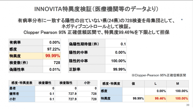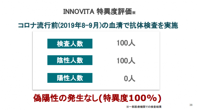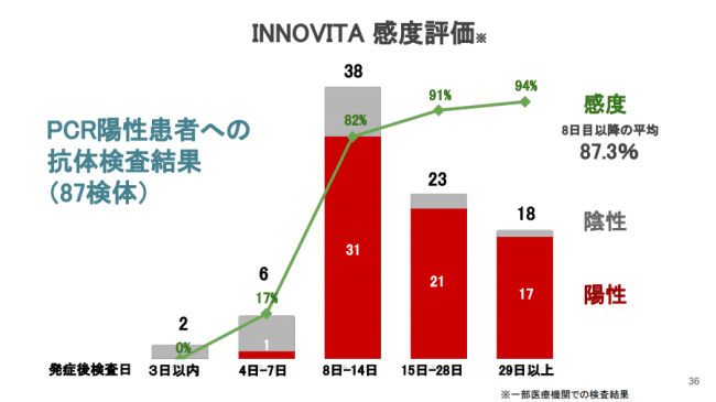 また、弊社が取り扱っているイノビータ(INNOVITA)社検査キットの信頼性についてもSBG独自の検証結果により、概ね問題ないとの評価をその場で得られました。その報告によると、INNOVITA社検査キットはまず新型コロナウイルス流行前の検体で検査を行い陰性率100%だったことを確認しており(特異度100%)、PCR陽性患者87名の検体で調べたところ、感度87.3%と、メーカーが出している値と同じ、INNOVITA社検査キットの検査精度の信頼度が実証されました。