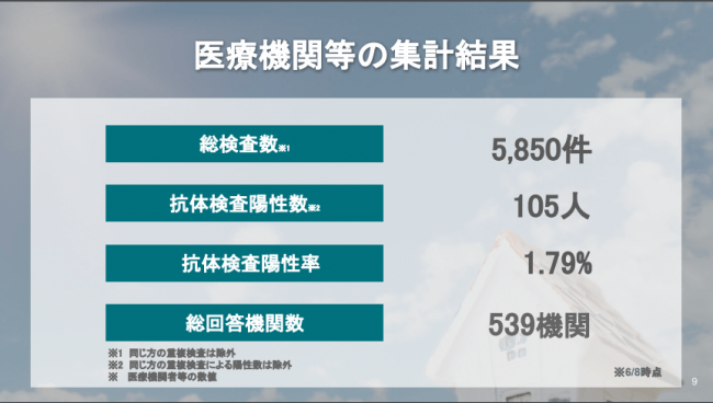 ソフトバンクグループは6月9日、同社の従業員や医療機関の関係者を中心とする4万人以上を対象に新型コロナウイルスの抗体検査を実施した結果、陽性率が0.43%だったとの速報値を発表しました。検査対象のうち5,850件が医療関係者で、陽性率は1.79%でした。