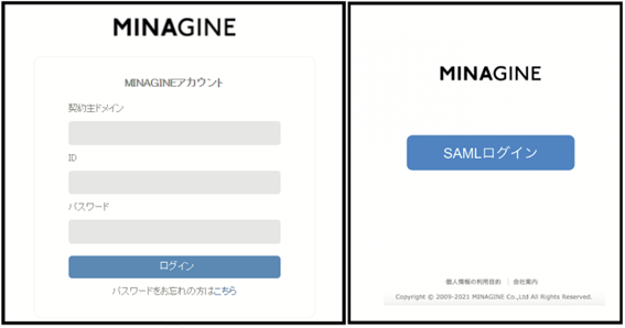 通常、MINAGINE就業管理にログインするためには、各ユーザーに割り当てられた「契約主ドメイン」と「ログインID」と「パスワード」を入力する必要があります。SAML認証によるシングルサインオンが可能となったことでそれらの入力を省略できるようになりました。これにより平易なパスワード設定を防止でき、セキュリティを高めることができます。