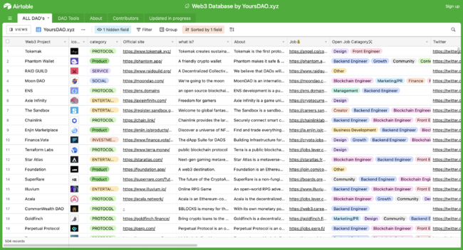 私たちは500以上のWeb3プロジェクトを集約したWeb3 Database( https://airtable.com/shr76fBgw2jsd4jXI/)の開発を行ってきましたが、そこで気付いたのは多くのWeb3プロジェクトにはコミュニティやフォーラムがあるにも関わらず、人材を雇うために従来の方法で求人を行っている事実です(最も成熟したDAOでさえ)。
