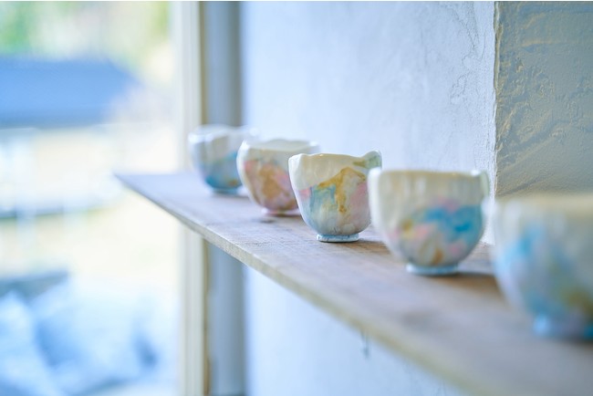 また、吉岡氏と松浦氏、それぞれの視点が重なり合い生まれた最先端の「金沢塗」の色彩は、江戸時代から続く「金沢塗」特有の漆による色彩ではなく、陶器に色鮮やかな10種類以上の塗料を重ね塗り、削り、感性を研ぎ澄ましながら器を描く技法となります。