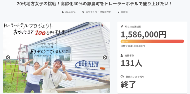 プロジェクトを進めていく内に、トレーラーを移設するための農地転用手続きや浄化槽などのインフラ投資、当初の予想よりも腐敗が進んだ内外装の補修などに費用がかさむことが想定されたため、不足する資金をクラウドファンディングによって調達しました。