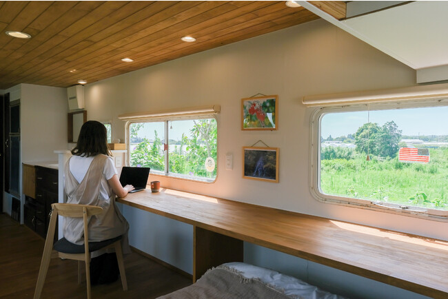 窓から見える畑を望みながら、ゆったりワーケーションができるように、広めのカウンターデスクを設けました。