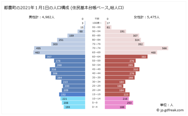 都農町は人口減少・高齢化が進み過疎地指定を受けています。全年代の中で、20代女性の比率がもっとも低く、町としても課題になっています。男女別のカテゴリーでもっとも人口が少ないのが25~29歳の女性で166人、その次に少ないのが、20~24歳の女性で184人です。