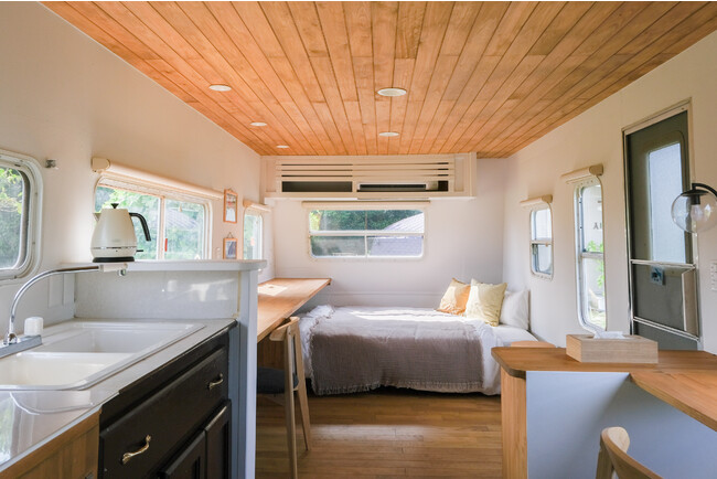 内装はトレーラーそのものの居心地を活かすため、天井と床は木材で仕上げ、なるべくシンプルに。