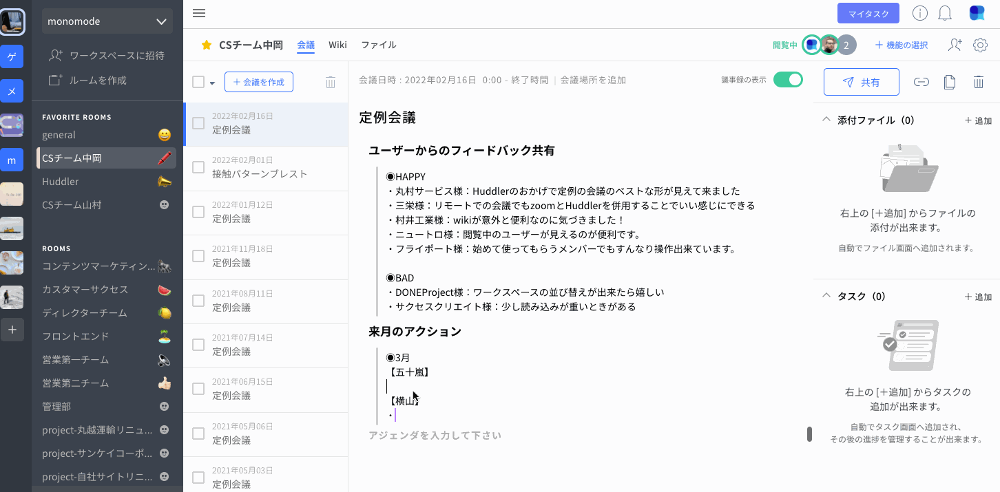 「会議」は議事録を書き溜めていき、そこで発生したタスクやファイルも含め管理することが出来る機能です。