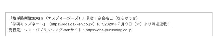 株式会社 ワン・パブリッシング(東京都品川区/代表取締役社長:廣瀬有二)は、2020年7月9日(木)より学研キッズネット(https://kids.gakken.co.jp/)にて学習まんが「地球防衛隊SDGs(エスディージーズ)」(https://kids.gakken.co.jp/kagaku/nandemo/edf_sdgs_01/)の連載をスタートいたしました。