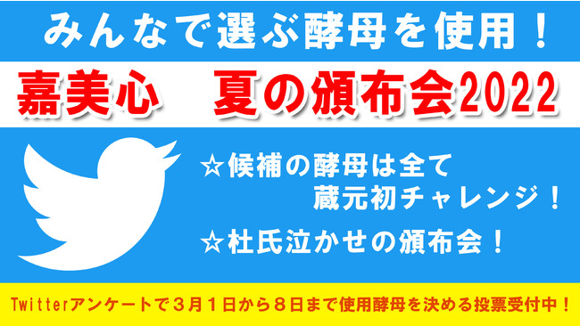 嘉美心酒造株式会社では、twitterのアンケート機能を使用し、一番得票数の多かった酵母で醸す『嘉美心 夏の頒布会2022 チャレンジシリーズ ~Episode1.~』を受注中です。