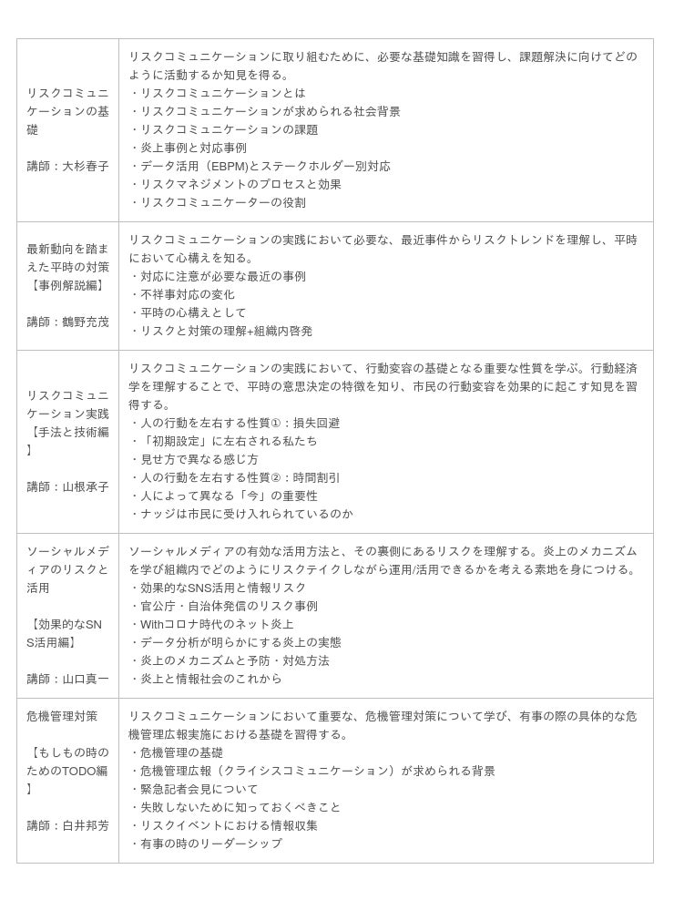 全5回の講座は、世界潮流のめまぐるしい変化のスピードに即したコミュニケーションスキルを体系的に学ぶことができる構成になっています。リスクコミュニケーションの基礎知識、実践において必要な国内外の最近事例からリスクトレンドの把握、市民の行動変容の基礎となる「行動経済学」の性質、さらにSNSの有効な活用方法とその裏側にあるリスクの理解や、有事の際の具体的な実務における危機管理広報/対策などについて解説しています。