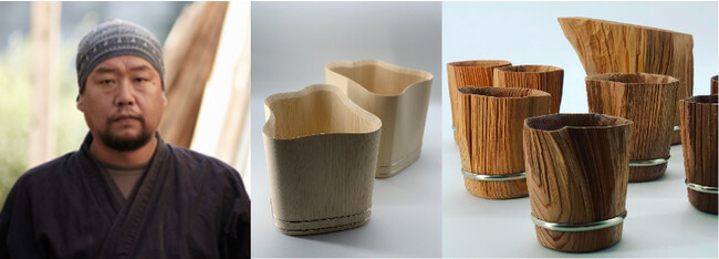 700年以上続く木桶の箍締め技法を用いた作品制作をしている中川木工芸比良工房。「YORISIRO」シリーズは、木の自然な曲がりをそのまま表現することで割れやゆがみを起こさないように木桶として再構築。また、「Wave」シリーズは、テコの原理を使うことで上方にタガをなくし自由な波型を表現している。