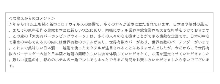 【内 容】 昨年来のコロナ禍の影響を受けた酒蔵や酒米生産者のサポートを目的に大丸有エリアの7つの有名ホテルやレストランが全国各地の日本酒・焼酎の酒蔵とコラボしてオリジナルカクテルを期間限定で提供。使用する日本酒・焼酎については全国の銘酒に精通した酒選定ディレクターの君嶋哲至氏が担当しました。