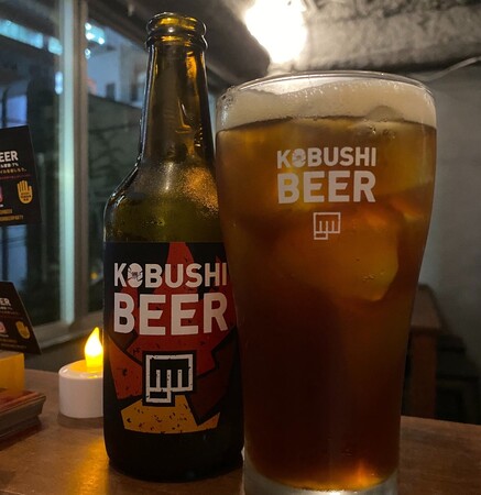 KOBUSHI BEERは、黒糖の甘みをベースにした深い味わいを持つアルコール度数7%のストロングペールエールです。クラッシュアイスで割る南国風スタイルがおすすめの飲み方です。