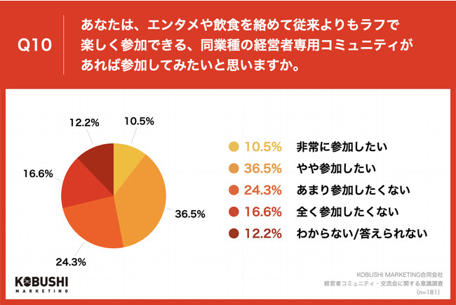 「Q10.あなたは、エンタメや飲食を絡めて従来よりもラフで楽しく参加できる、同業種の経営者専用コミュニティがあれば参加してみたいと思いますか。」(n=181)と質問したところ、「非常に参加したい」が10.5%、「やや参加したい」が36.5%という回答となりました。