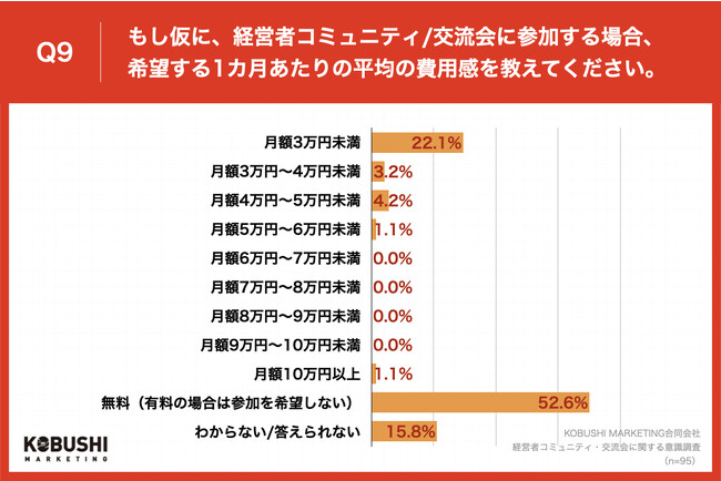 Q1で「一度もない」と回答した方に、「Q9.もし仮に、経営者コミュニティ/交流会に参加する場合、希望する1カ月あたりの平均の費用感を教えてください。」(n=95)と質問したところ、「月額3万円未満」が22.1%、「月額3万円~4万円未満」が3.2%という回答となりました。