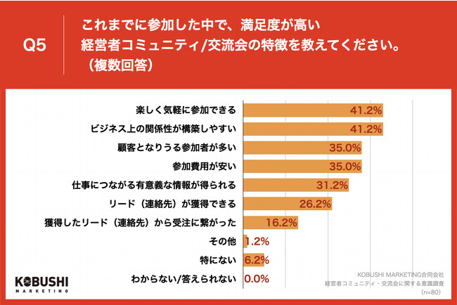 Q1で「1度だけある」「何度もある」「数回程度ある」と回答した方に、「Q5.これまでに参加した中で、満足度が高い経営者コミュニティ/交流会の特徴を教えてください。(複数回答)」(n=80)と質問したところ、「楽しく気軽に参加できる」が41.2%、「ビジネス上の関係性が構築しやすい」が41.2%、「顧客となりうる参加者が多い」が35.0%という回答となりました。