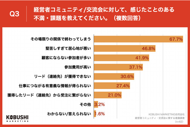 Q2で「かなりある」「ややある」と回答した方に、「Q3.Q2で「かなりある」「ややある」と回答した方にお聞きします。経営者コミュニティ/交流会に対して、感じたことのある不満・課題を教えてください。(複数回答)」(n=62)と質問したところ、「その場限りの関係で終わってしまう」が67.7%、「堅苦しすぎて居心地が悪い」が46.8%、「顧客にならない参加者が多い」が41.9%という回答となりました。