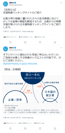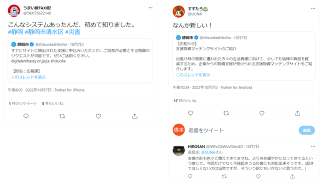 情報マッチングサイトの利用者は、被災状況についてアンケートに答えていただくほか、支援者からの救援物資を受け取るなど復旧に伴う各種サポートを受けられます。デジタル技術を活用しておりますので、双方の負担軽減が期待されています。本マッチングサイト(デジタル大使館)は静岡市のツイッターから10/7に先行公開されており、今日現在で延べ17,460人が流入するなど関心度の高さが見受けられます。*2