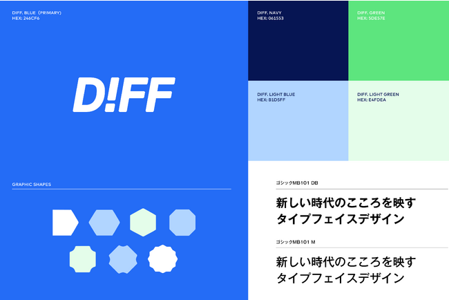 ロゴブランドの目印カラーとなるDIFF.ブルーを中心に、エンパワーメントする存在であるという安心感やスポーティーなイメージを反映し、エネルギッシュなDIFF.グリーンをアクセントカラーとして足したパレットを作成。