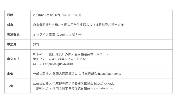 一般社団法人外国人雇用協議会(東京都港区、代表理事 原 英史)は、2020年12月18日(金)に、外国人留学生を受け入れる教育機関の経営者様、生活および進路指導担当者様を対象とした、オンラインセミナーを開催いたします。