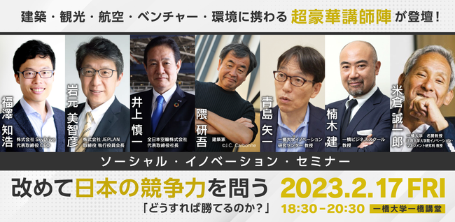 2023年2月17日開催予定のソーシャル・イノベーション・セミナーでは、『日本再生の可能性』をテーマに、隈 研吾(建築家)、井上 慎一(全日本空輸株式会社 代表取締役社長)、岩元 美智彦(株式会社JEPLAN 取締役 執行役員会長)、福澤 知浩(株式会社SkyDrive 代表取締役CEO)、青島 矢一(一橋大学イノベーション研究センター 教授)、楠木 建(一橋ビジネススクール 教授)、米倉 誠一郎(一橋大学名誉教授、法政大学大学院イノベーション・マネジメント研究科 教授、一般社団法人 Creative Response 代表理事)といった7名の超豪華講師陣を迎え開催される。