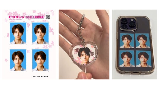 「推し」の写真を証明写真として印刷。(中)オリジナルキーホルダーの作成事例。(左)「推し」を証明写真として印刷し、スマホケース裏側に貼る事例。