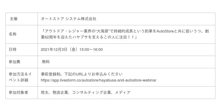 ノルウェーのロボティクステクノロジー企業であるAutoStore(日本法人:オートストア システム株式会社、社長:鴨弘司、以下、「オートストア」)は、2021年12月3日(金)に「アウトドア・レジャー業界の“大海原”で持続的成長という釣果をAutoStoreと共に狙いうつ。創業62周年を迎えたハヤブサを支えるこの人に注目!!」と題した無料のオンラインセミナーを開催します。