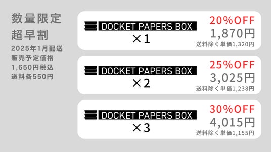 期間中は「DOCKET PAPERS BOX(定価・1,650円税込)」を最大30%OFF(各割引率ごとに数量限定)で先行予約購入をいただくことができます。