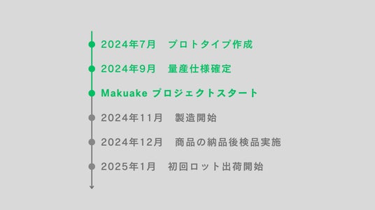 クラウドファンディング終了後は、2024年1月中旬より2月末までにリターンとしての商品を発送。初回生産予定数を超えた商品については、3月以降の出荷を予定しております。