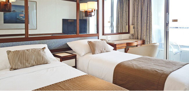 また、船内生活の中でいつでも海を近くに感じられるよう、船室は海側に面した窓付きのタイプを豊富に備えています。そのうち7割にのぼる410室がバルコニー付き。ラグジュアリーなスイートルームから機能的にまとまったリーズナブルな船室まで、上質なプライベート空間をご提供します。世界一周を通じてご友人をつくりたいという方や、旅行代金をリーズナブルに抑えたいという方に向けた相部屋クラスもご用意しています。
