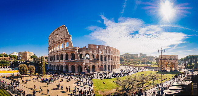 巨大円形闘技場コロッセオも古代ローマを象徴する場所のひとつ。4階層の観客席や猛獣を収容していた地下施設を歩けば、往時のスペクタクルが伝わってきます。