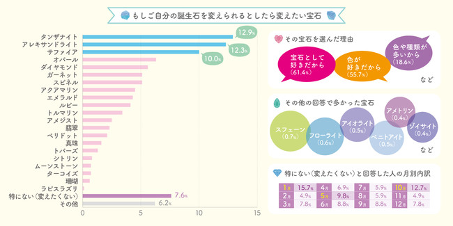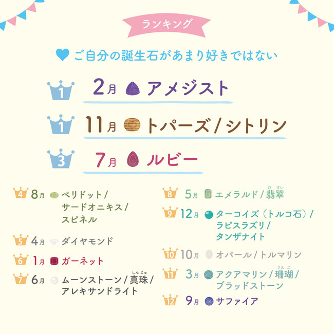 この調査の期間中、全国宝石卸商協同組合より63年ぶりに誕生石を改訂するという発表がなされ、スフェーン(新7月の誕生石)やアイオライト(新3月の誕生石)も追加されたため、もしかしたらその影響もあったかもしれません。