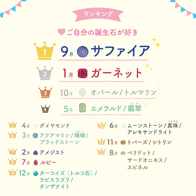 ご自分の誕生石が「好き」と回答された方を月別に集計し、ランキングで並べたところ下記のような結果となりました。