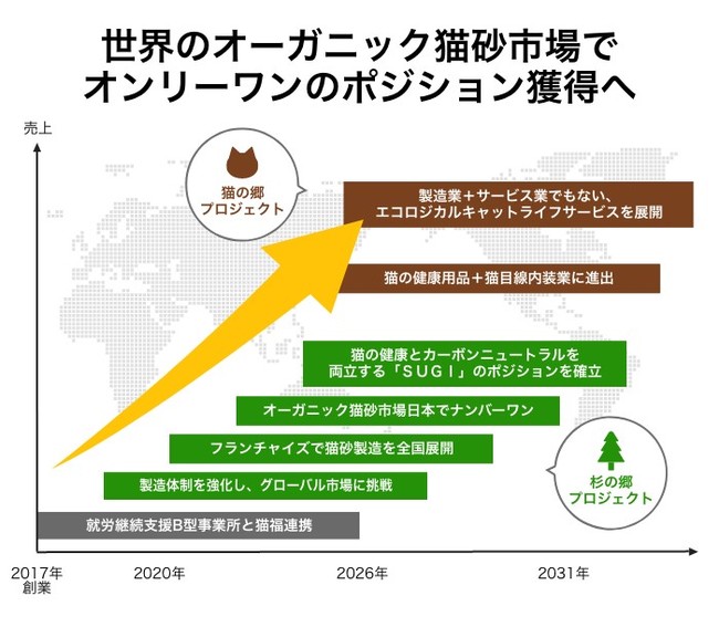 全世界6億3000万匹の猫が必需品とする「猫砂」市場で拡大する「オーガニック猫砂」のニーズに応えてグローバル展開し、5年後の2027年のIPOを目指す杉のチカラ株式会社(埼玉県久喜市、代表取締役:高橋 則之)は、スピード感を持って事業の確立をしていくため、株式投資型クラウドファンディングによる資金調達プロジェクトに挑戦することをお知らせいたします。
