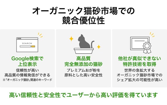☆他社が真似できない特許技術:世界で拡大するオーガニック猫砂市場でのシェア拡大の可能性が高い