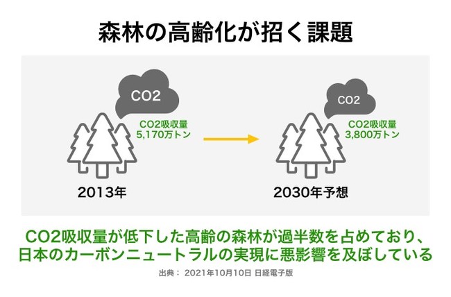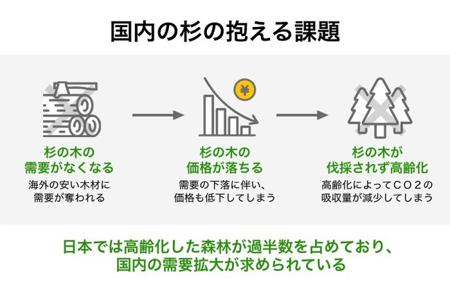 また、日本の森林では、需要低下によって伐採されなくなり高齢化した杉が問題になっています。高齢化した杉は、CO2吸収力がどんどん低下していきます。こうした高齢の杉の需要を高め利活用することで新陳代謝を促進し森林を蘇らせることで、カーボンニュートラルの実現に貢献します。