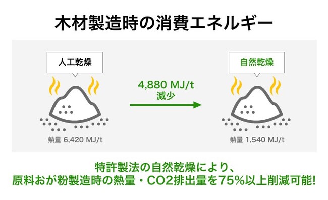 また『杉にゃん』の特許製法は従来の木質系猫砂の製法と比較して75%以上のCO2排出削減が可能です。