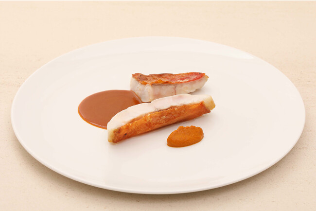 金目鯛はキュイソン・ナクレという表面がつややかに仕上がるナチュラルな火入れをし、魚の出汁にオレンジ、サフランを加えた複雑な旨みのソースを添えました。パプリカのベースにナッツやトマトを加えたロメスコソースをアクセントに。
