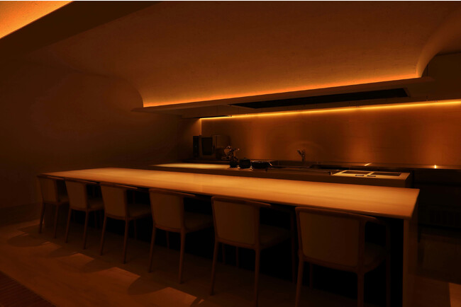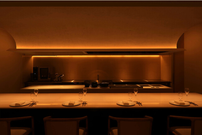 ダイニングエリアは優しいベージュトーンで統一され、ナチュラルで温かい雰囲気の中でリラックスしてお食事が楽しめます。6席のカウンターはキッチンで料理ができあがる様子を臨場感たっぷりに体験できるシェフズテーブル。トンネル状の通路をくぐった先にあるホールエリアは、まえばしガレリアにふさわしいアートと料理を共に味わえるダイニングルーム。用途に合わせて、使い分けていただけます。