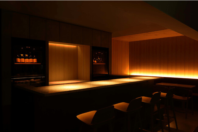 店内は緩やかに3つの空間に分かれています。エントランスを入ると現れるのが、バースペース。オレンジやイエローの砕石がまだらなテラゾーのカウンターに木製のスツールで落ち着いた中にも親しみやすさのある空間です。